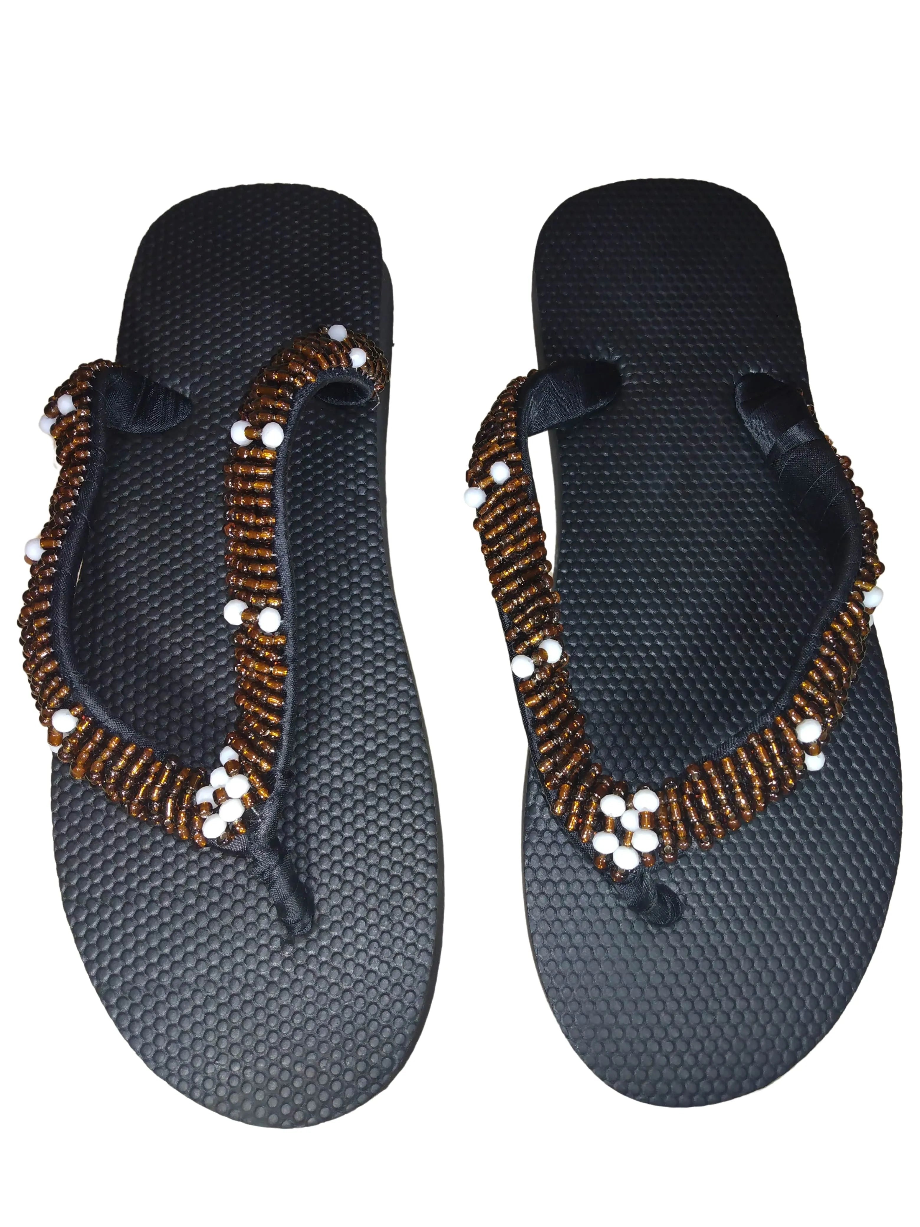 The campus sophisticate beaded flip flop are made by a group of tribal women in a small town in Nigeria. A member of this group helped fix the sandals of a white American woman who was touring a street market in this Nigerian city with her husband. After fixing the broken sandals on the spot for free and handing it back to the woman with a big smile on her face, the white woman smiled back saying, "you should make sandals because you are so good at it." She gave the African woman a $20 tip, hugged her,