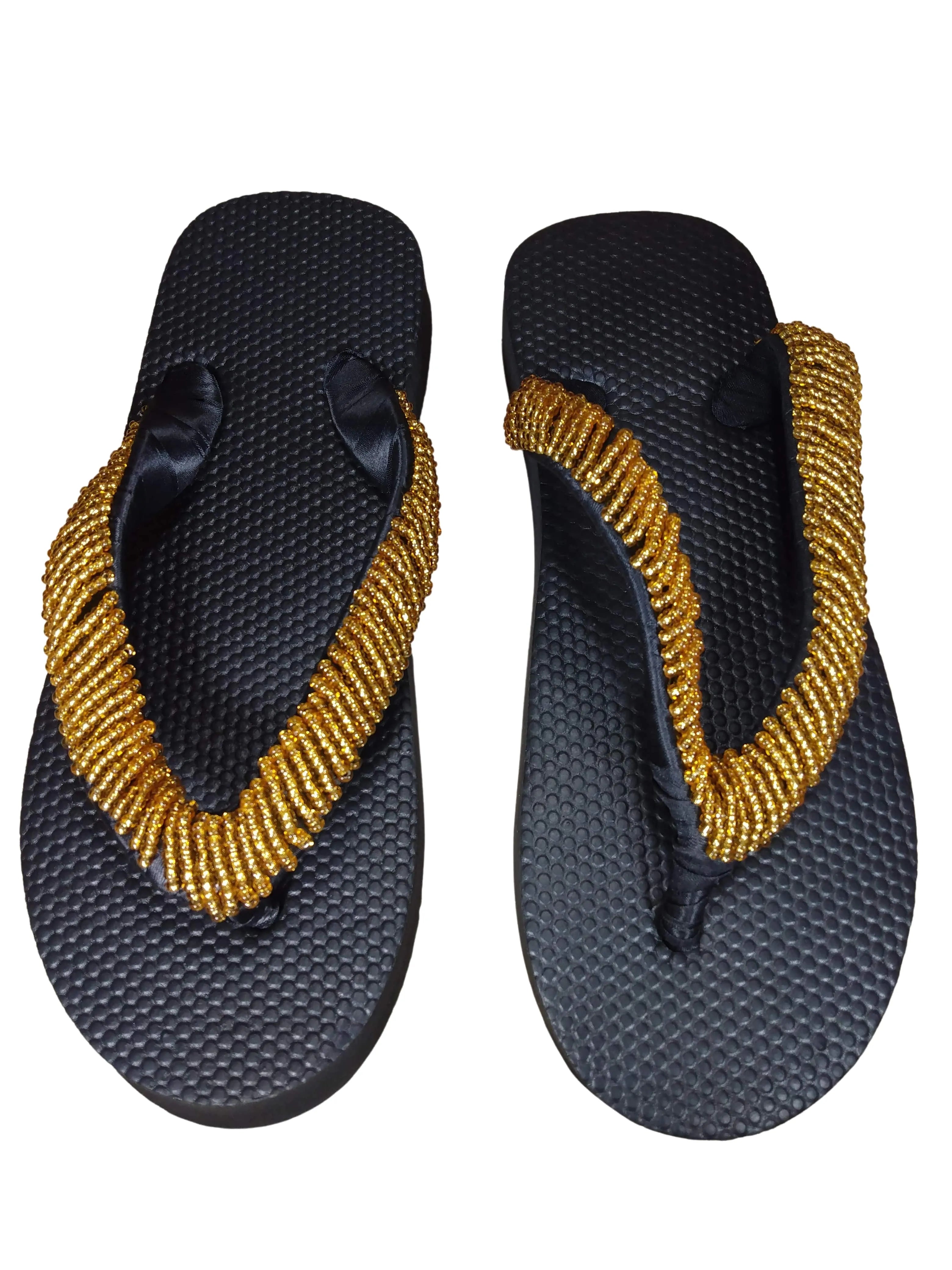 The campus sophisticate beaded flip flop are made by a group of tribal women in a small town in Nigeria. A member of this group helped fix the sandals of a white American woman who was touring a street market in this Nigerian city with her husband. After fixing the broken sandals on the spot for free and handing it back to the woman with a big smile on her face, the white woman smiled back saying, "you should make sandals because you are so good at it." She gave the African woman a $20 tip, hugged her,