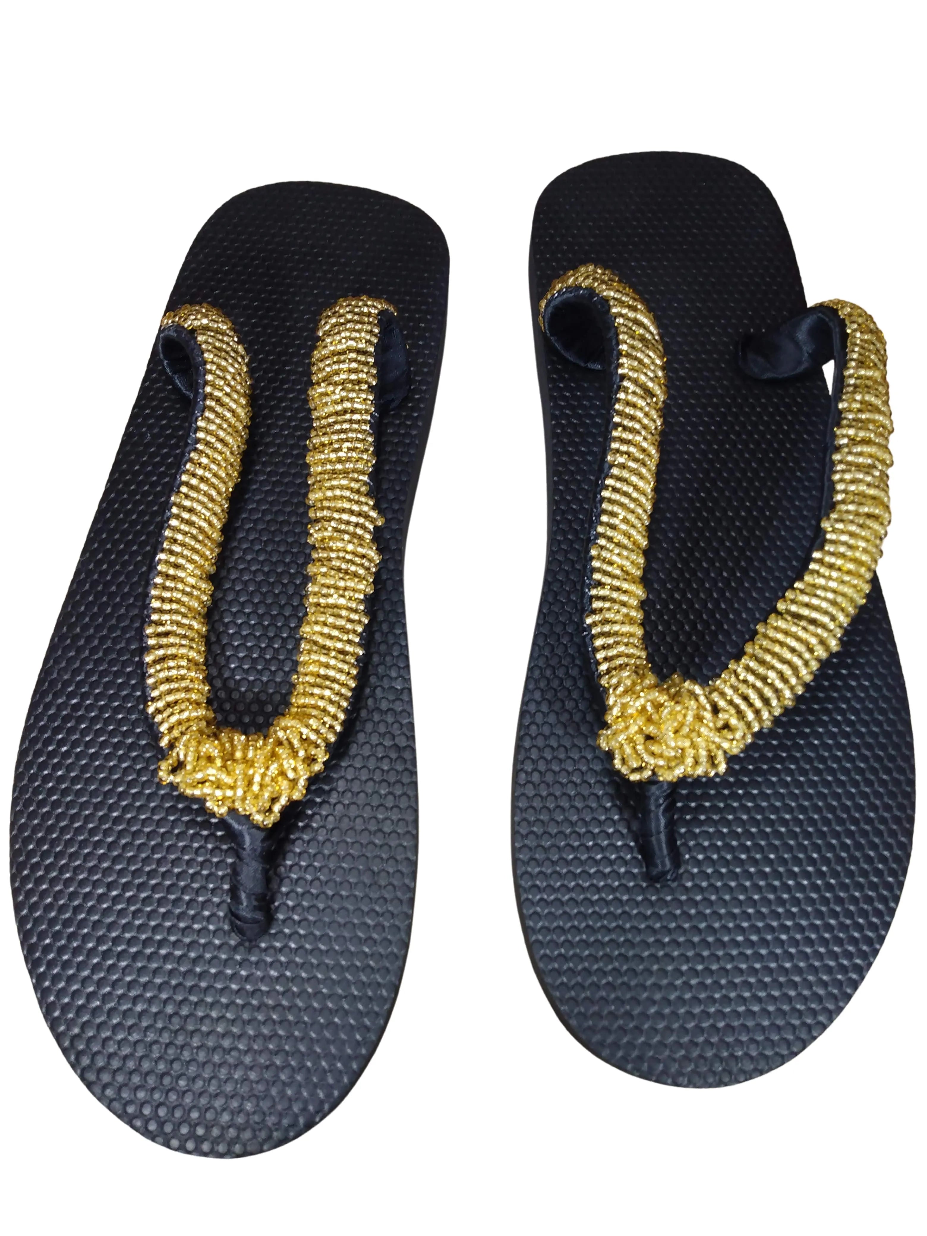 The campus sophisticate beaded flip flop are made by a group of tribal women in a small town in Nigeria. A member of this group helped fix the sandals of a white American woman who was touring a street market in this Nigerian city with her husband. After fixing the broken sandals on the spot for free and handing it back to the woman with a big smile on her face, the white woman smiled back saying, "you should make sandals because you are so good at it." She gave the African woman a $20 tip, hugged her,