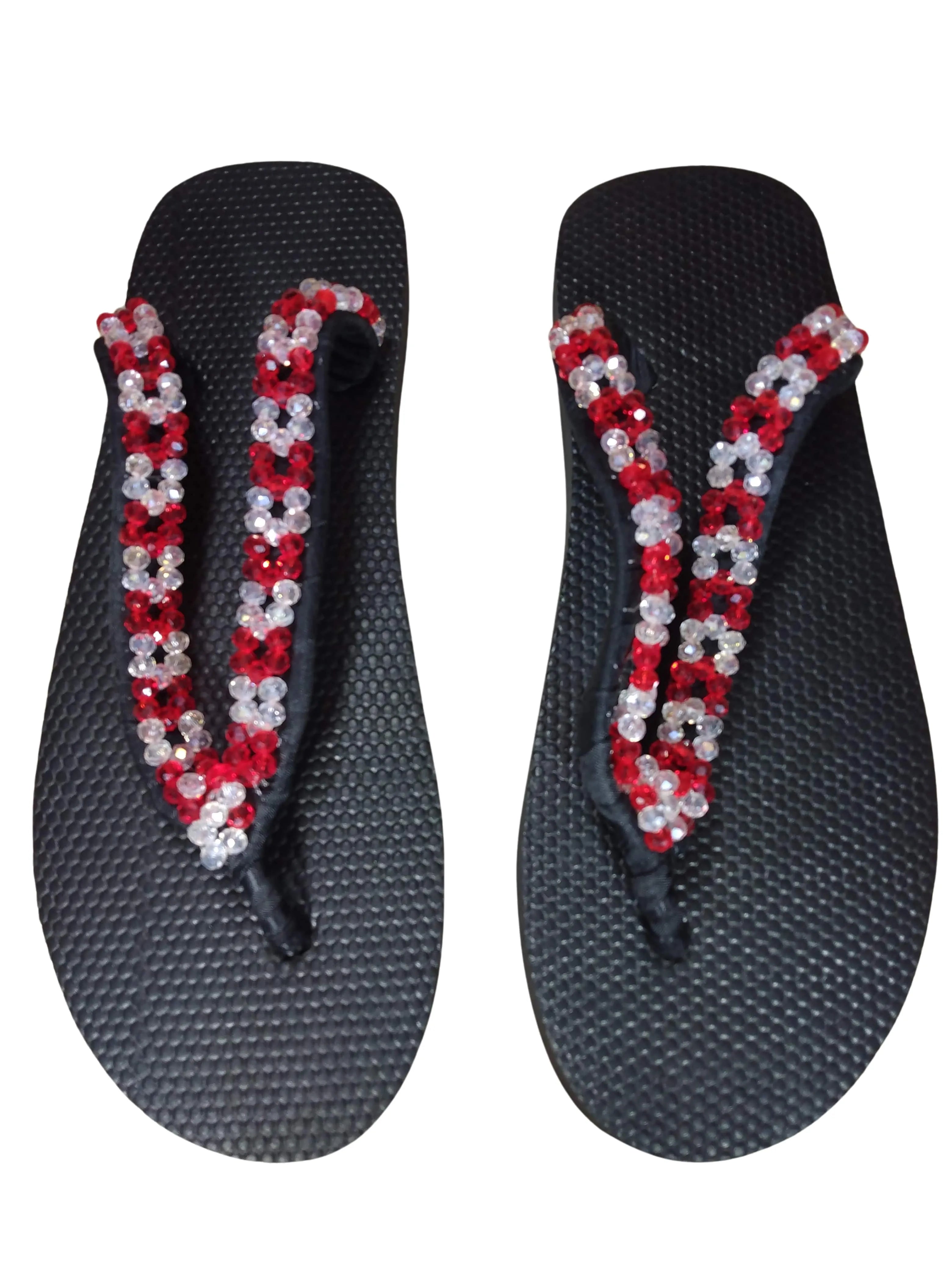 The campus sophisticate beaded flip flop are made by a group of tribal women in a small town in Nigeria. A member of this group helped fix the sandals of a white American woman who was touring a street market in this Nigerian city with her husband. After fixing the broken sandals on the spot for free and handing it back to the woman with a big smile on her face, the white woman smiled back saying, "you should make sandals because you are so good at it." She gave the African woman a $20 tip, hugged her,