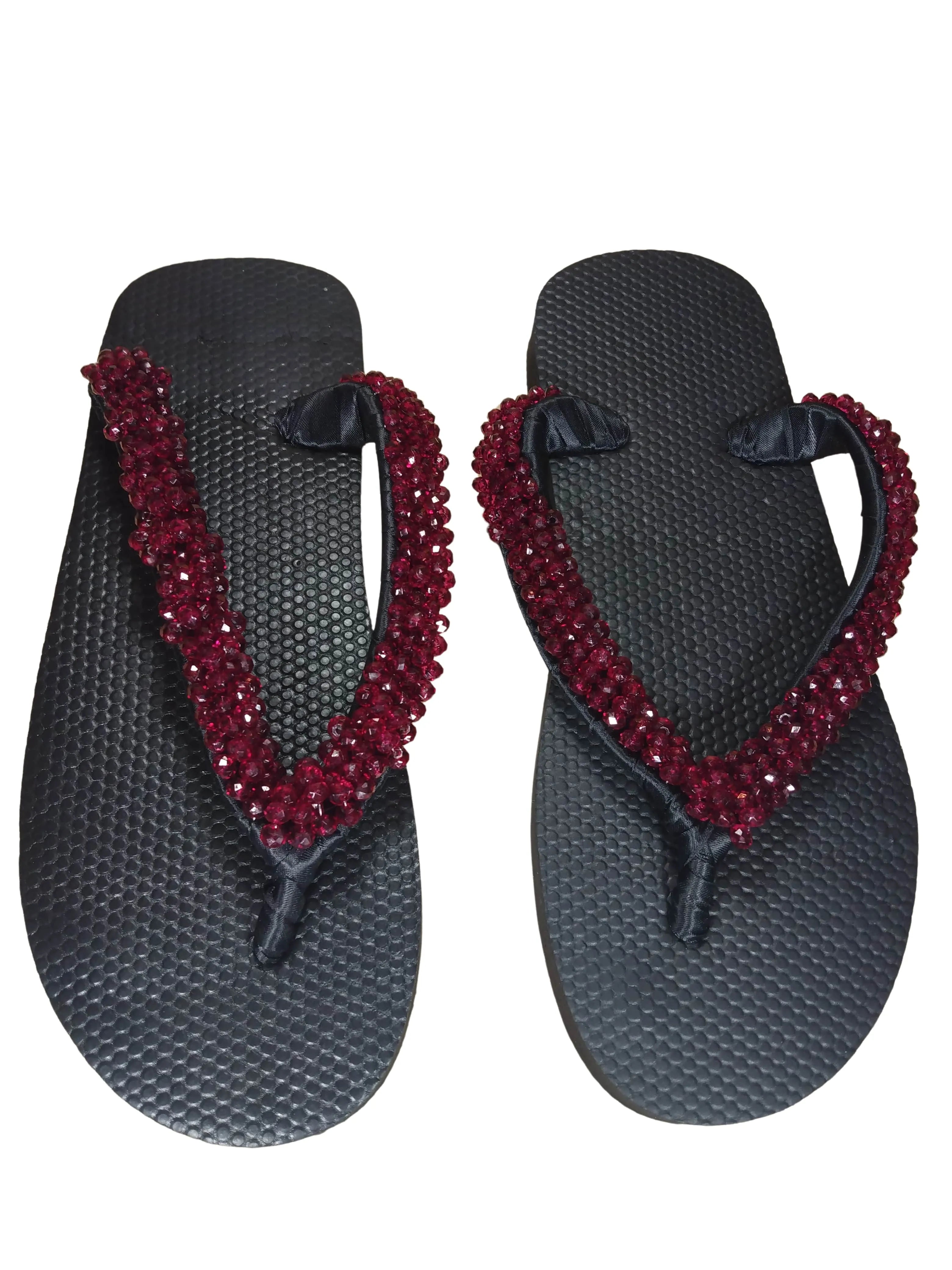 This pair of beaded flip flops from Nigeria is perfect for your indoor and outdoor summer activities. A beautiful selection of beads to make your feet sparkle. Designed to prevent slipping and sliding.