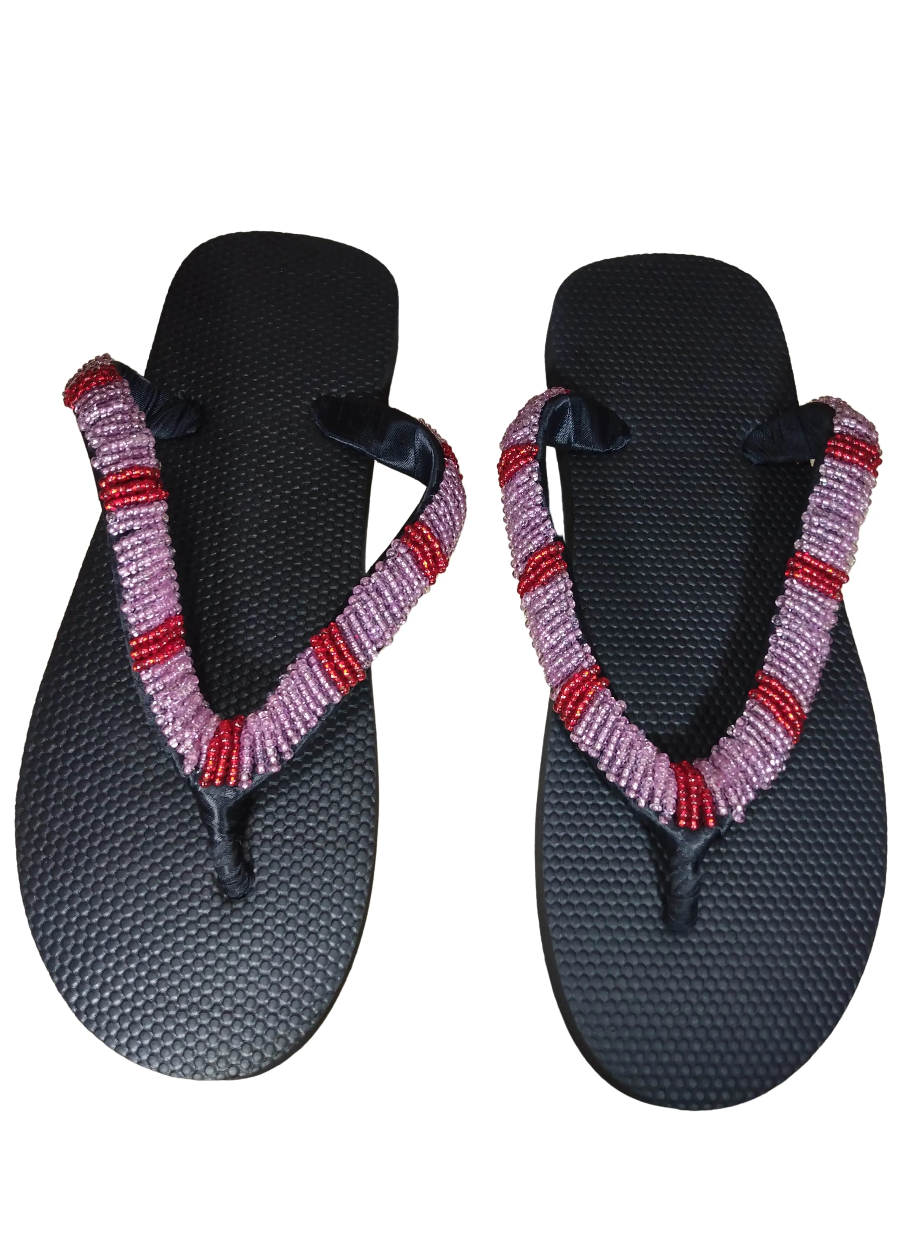 The campus sophisticate beaded flip flop are made by a group of tribal women in a small town in Nigeria. A member of this group helped fix the sandals of a white American woman who was touring a street market in this Nigerian city with her husband. After fixing the broken sandals on the spot for free and handing it back to the woman with a big smile on her face, the white woman smiled back saying, "you should make sandals because you are so good at it." She gave the African woman a $20 tip, hugged her,