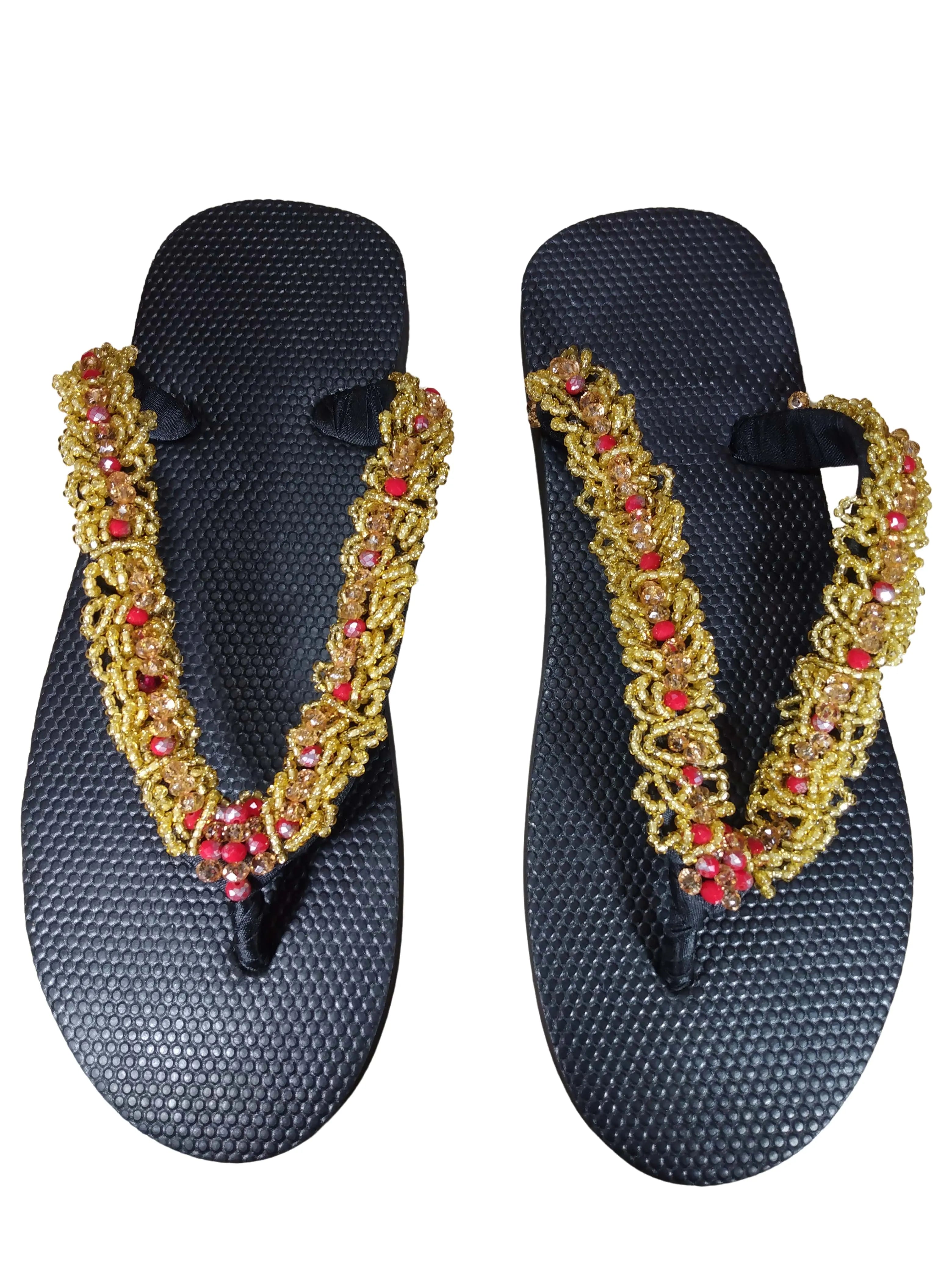 The campus sophisticate beaded flip flop are made by a group of tribal women in a small town in Nigeria. A member of this group helped fix the sandals of a white American woman who was touring a street market in this Nigerian city with her husband. After fixing the broken sandals on the spot for free and handing it back to the woman with a big smile on her face, the white woman smiled back saying, "you should make sandals because you are so good at it." She gave the African woman a $20 tip, hugged her,