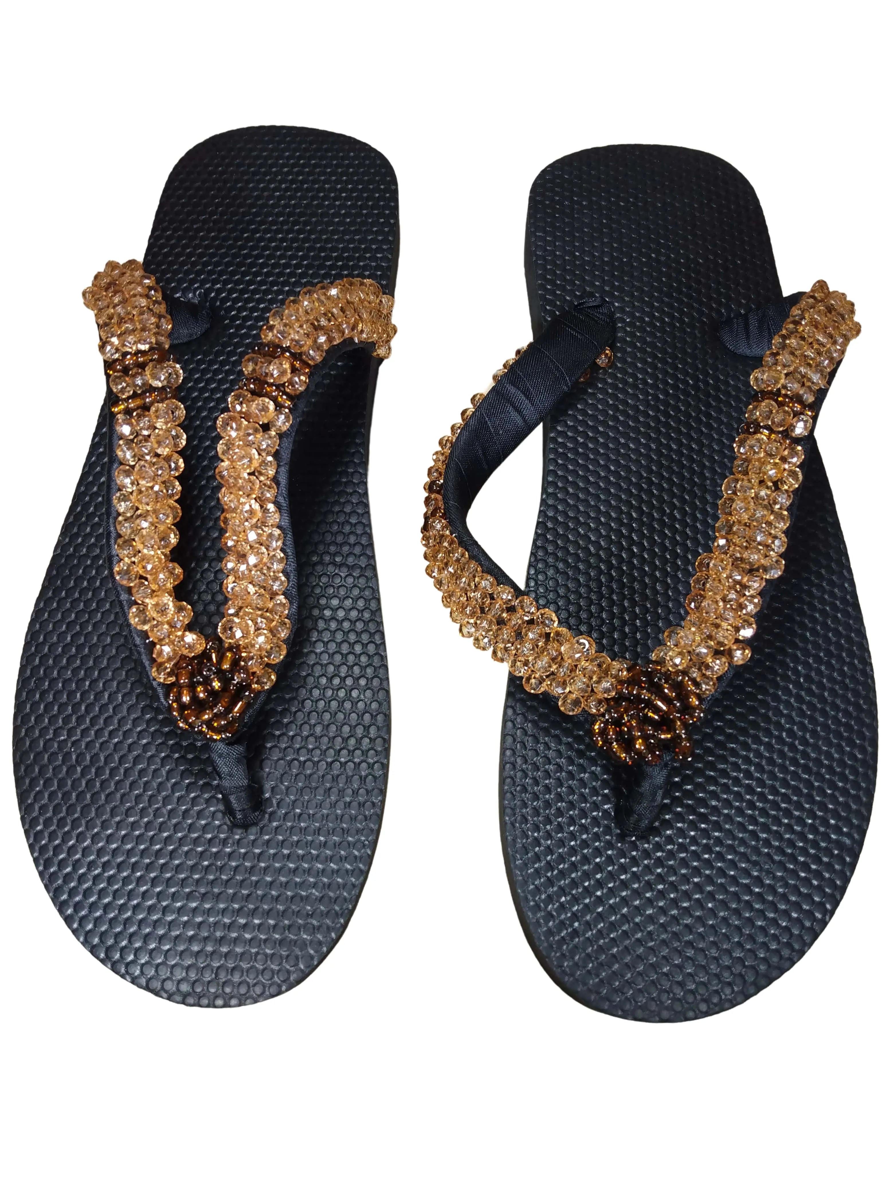 The campus sophisticate beaded flip flop are made by a group of tribal women in a small town in Nigeria. A member of this group helped fix the sandals of a white American woman who was touring a street market in this Nigerian city with her husband. After fixing the broken sandals on the spot for free and handing it back to the woman with a big smile on her face, the white woman smiled back saying, "you should make sandals because you are so good at it." She gave the African woman a $20 tip, hugged her,