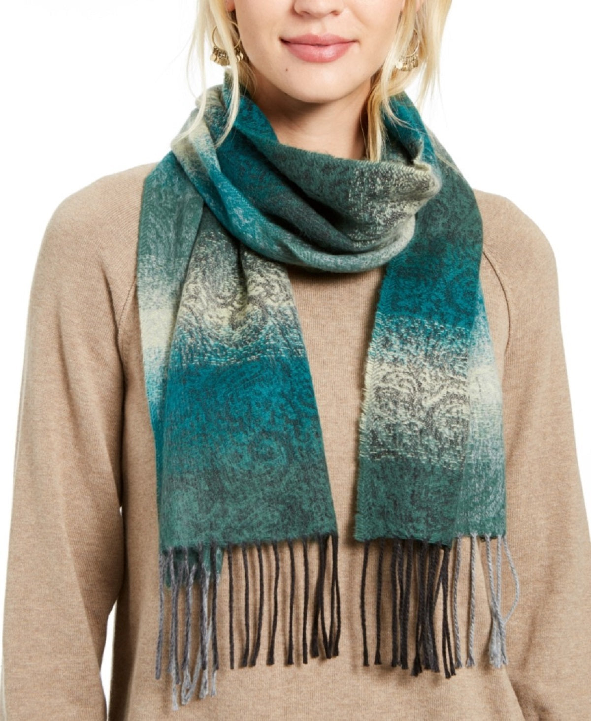 Cejon Fringe Green Ombre Paisley Italian Scarf. A cozy essential in a gorgeous green hue. Wrap up in Cejon's timeless Italian acrylic scarf.