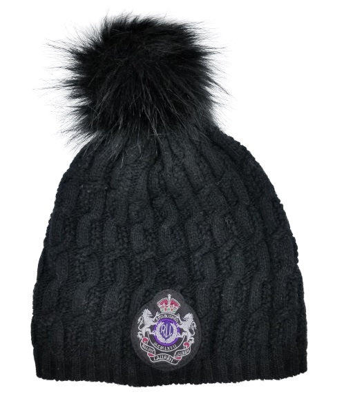 Lauren Ralph Lauren Black Cable-Knit Patch Beanie. A logo patch adds signature sophistication to Lauren Ralph Lauren's cable-knit beanie, while a faux-fur pom-pom adds a touch of fluffy fun.