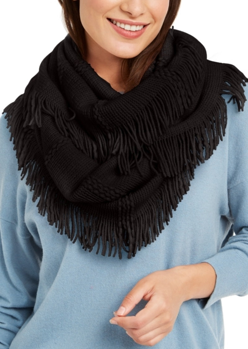INC International Concepts Raschel-Knit Loop Scarf with Fringe in Black. Add cool style and soft comfort to your look with I.N.C. International Concepts' fringed raschel-knit loop scarf.