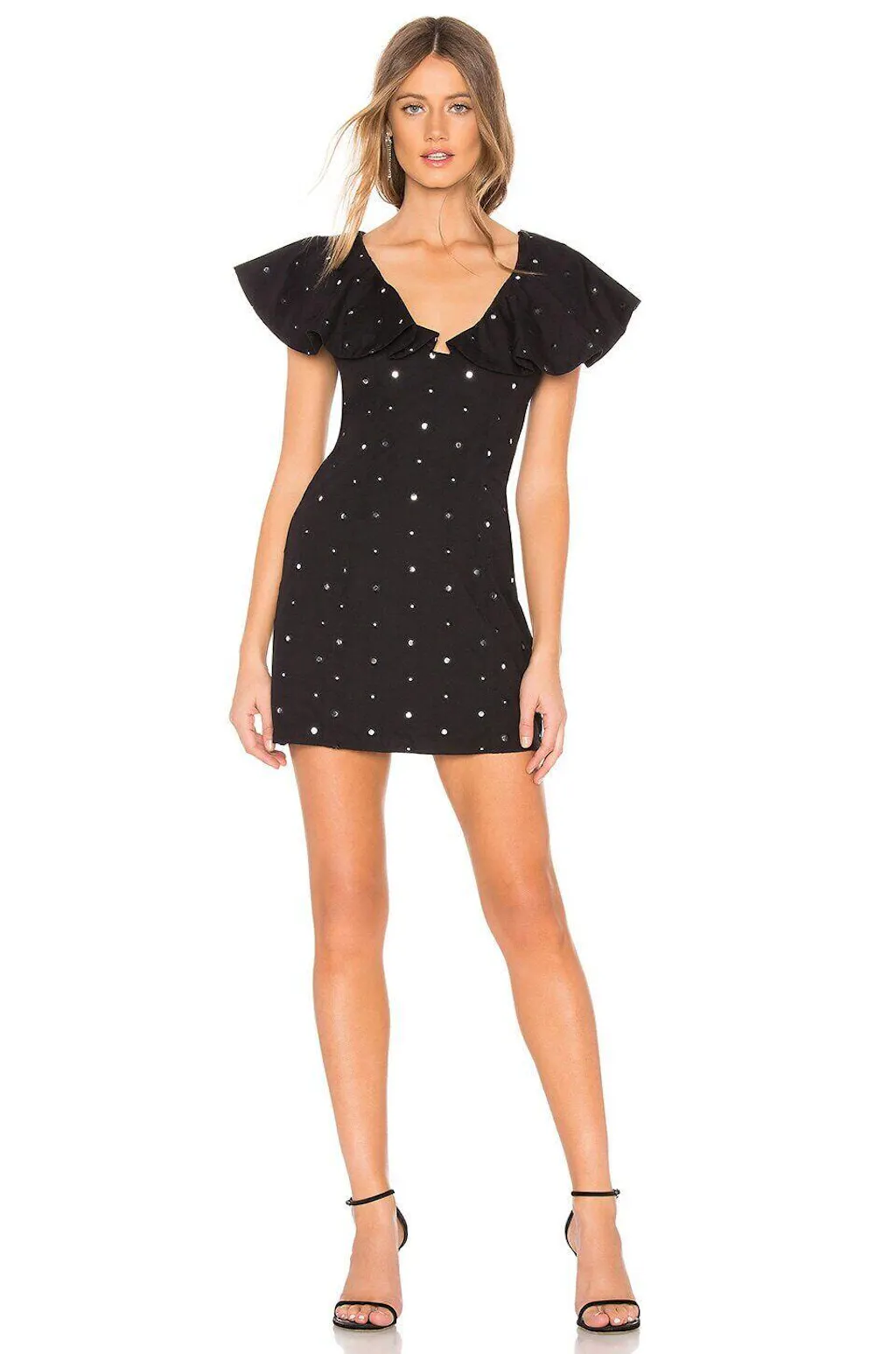 Looking for the perfectCute Black Mini Dress that combines glamour and sophistication? The Lovers + Friends Lulu Mini Dress in black offers just that. With its stunning allover mirrored disc accents and flounce sleeves, this mini black dress is designed to turn heads and elevate your style for any occasion.