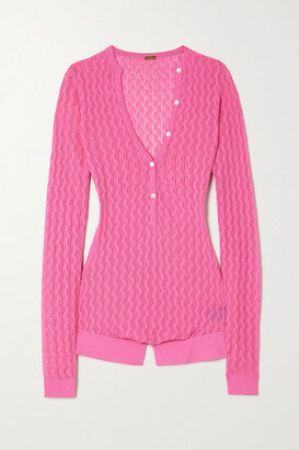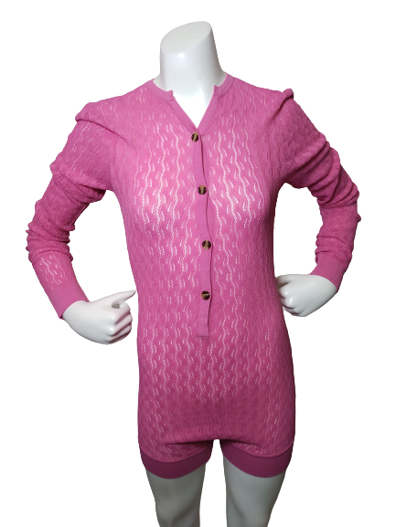 Pink Sheer Knit Romper with Replaced Buttons: This stunning Dodo Bar Or Helen Romper in pink with the Black Replaced Buttons is the perfect addition to any wardrobe.