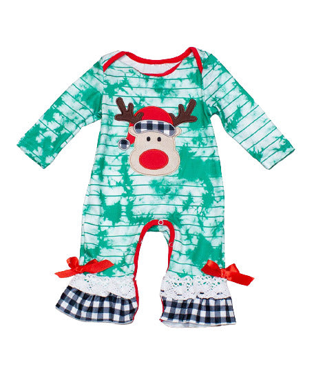 Green & Red Tie-Dye & Gingham Reindeer Ruffle-Cuff Playsuit - baby 9/12M