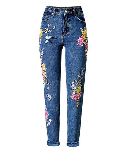 Blue Floral-Embroidered Jeans