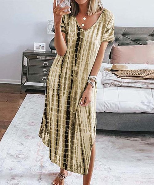 Khaki Tie-Dye V-Neck Maxi Dress