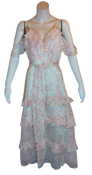 Eggshell Combo Drop Shoulder with Leaves and Polka Dots Tiered Dress 98% Polyester, 2% Metallic