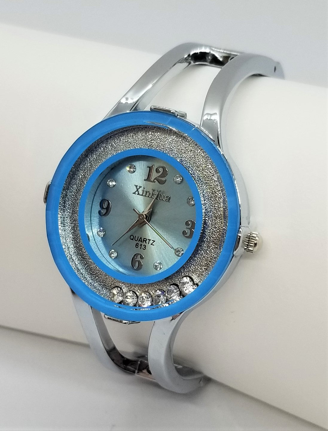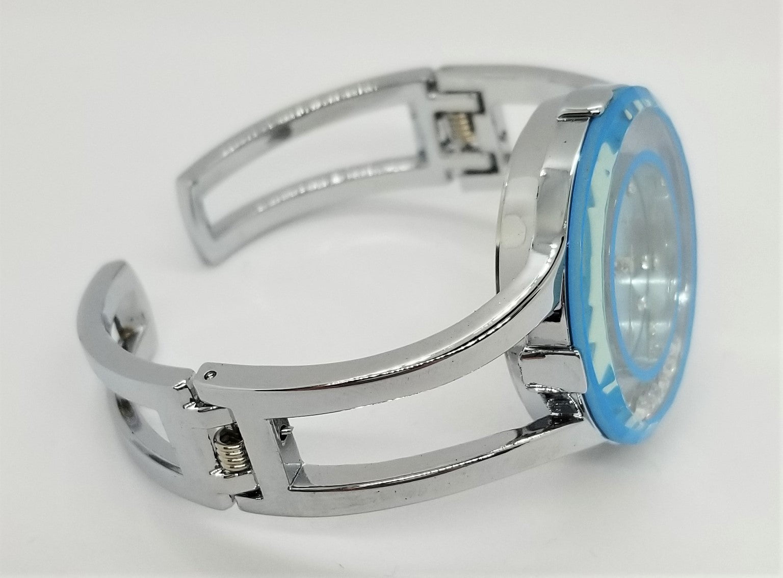 Women's Watch with Crystal Accents, Bright Blue Face Frame, and Spring Closure. Water resistant.