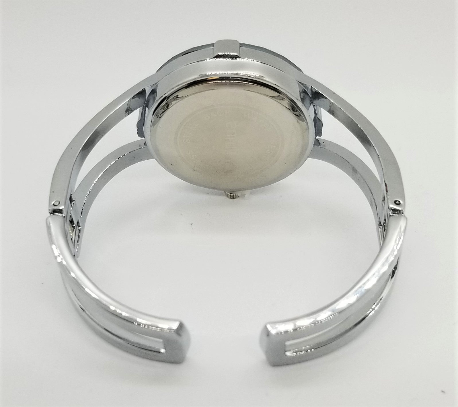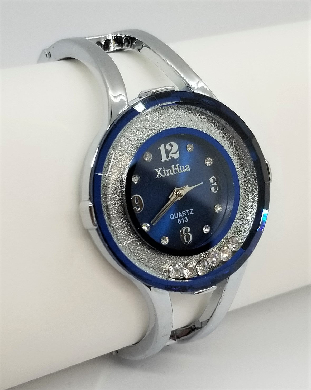 Women's Watch with Crystal Accents, Dark Blue Face Frame, and Spring Closure. Water resistant.