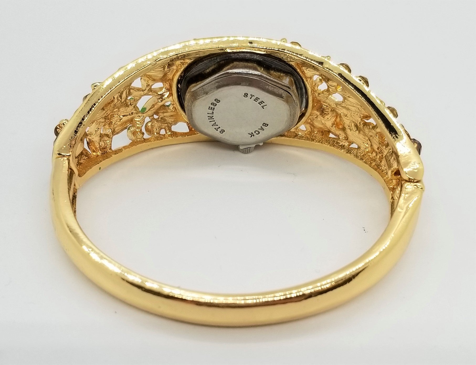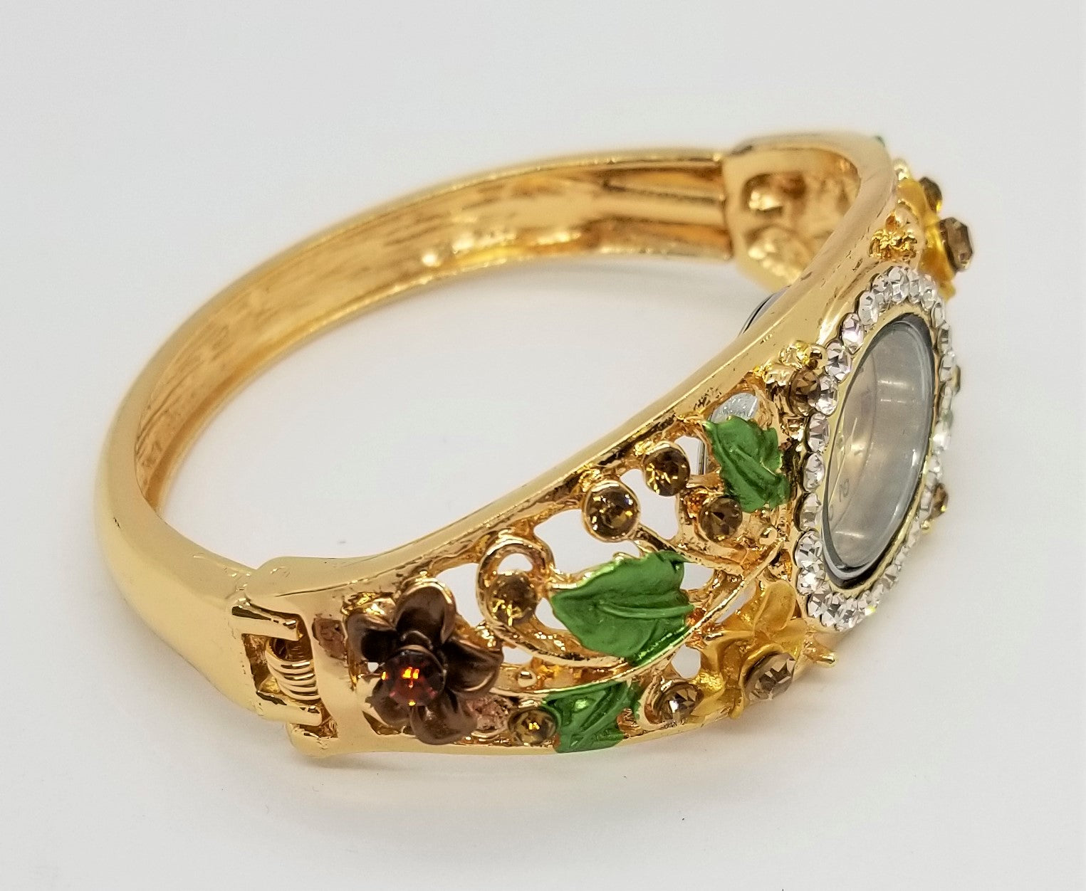 Women's Gold-Tone Watch with Decorative Flower and Crystal Accents in Yellow.