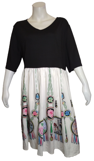 Dress, Plus, 3X, Flowers, Buildings, Black, White, Greens, Pinks