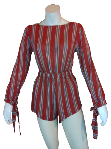 Brown Striped Romper with tie 65% Cotton, 35% Poly