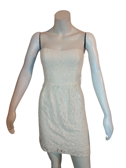 White Lacey Strapless belted Dress (belt not included) 65% Cotton, 35% Nylon, Lining 100% Poly
