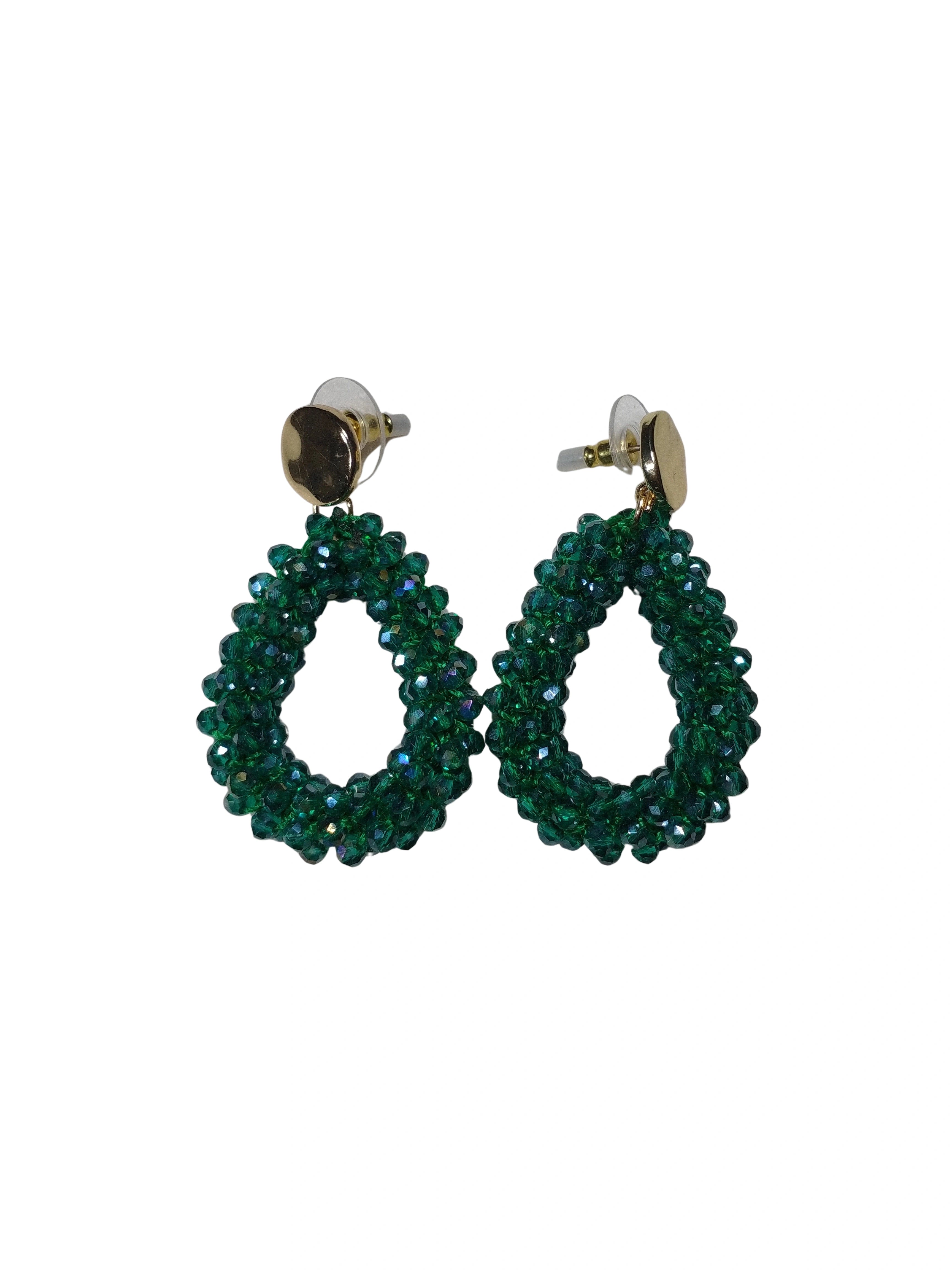 - Gold-tone hoop design with embedded green rhinestones